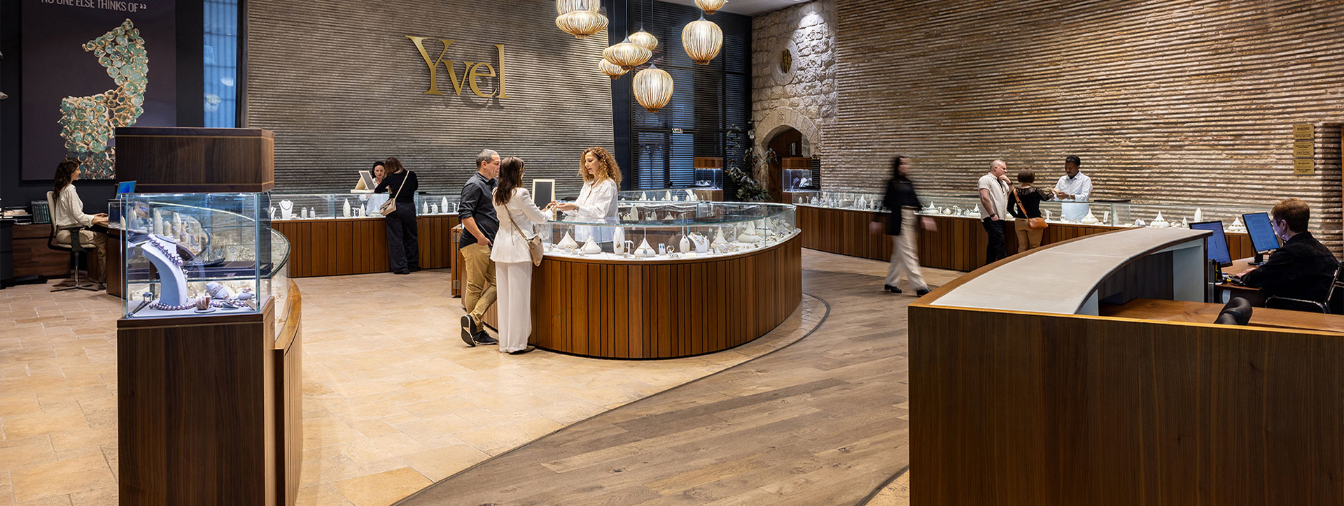 Upon arrival, immerse yourself in the lush flower gardens, sweet-smelling fruit trees, and cascading waterfalls that serve as inspiration for Yvel's exquisite designs. A soothing water wall and walkway transport you into the depths of the ocean, the origin of Yvel's extraordinary pearls.